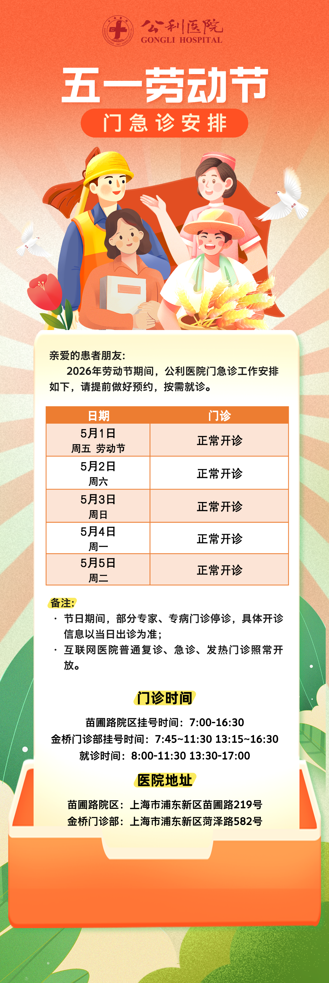 【公利告示】公利医院2026年“劳动节”期间门急诊照常开诊!转发周知→
